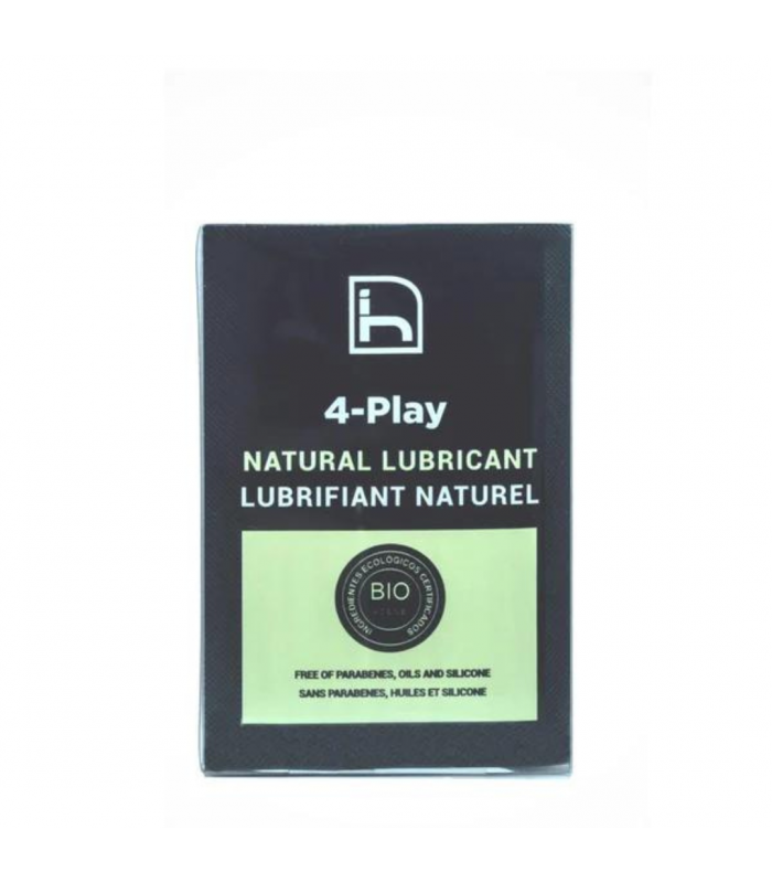 4-PLAY es un lubricante natural en gel de base agua, perfecto para usar con preservativos. Su fórmula extra deslizante, con aloe vera ecológico, proporciona un deslizamiento prolongado sin secarse. No mancha sábanas ni ropa y es fácil de retirar con agua. Sin parabenos, aceites, siliconas ni perfume. Caja de 10 monodosis de 5 ml cada una.